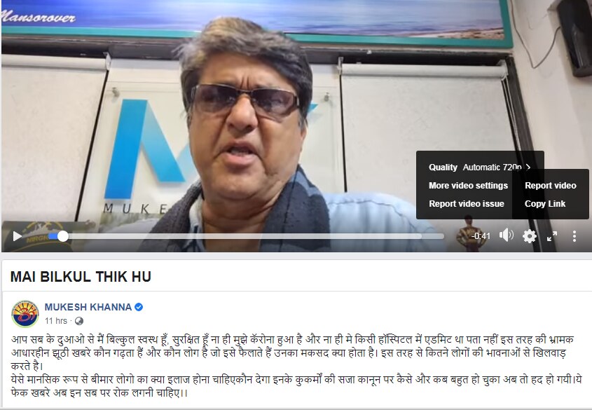 తన మరణ పుకార్లను ఎత్తిచూపిన ప్రముఖ నటుడు ముఖేష్ ఖన్నా ఫేస్బుక్లోకి తీసుకెళ్లి ఒక వీడియోను పంచుకున్నారు. వీడియోలో, నటుడు తన ఆరోగ్యం గురించి మాట్లాడాడు మరియు అతని గురించి తప్పుడు పుకార్లు వ్యాప్తి చేసినవారిపై నినాదాలు చేశాడు. హిందీలో అతని పోస్ట్ అనువదించబడింది, “మీ ఆశీర్వాదంతో, నేను పూర్తిగా ఆరోగ్యంగా మరియు సురక్షితంగా ఉన్నాను. నాకు కోవిడ్ -19 లేదు మరియు నన్ను ఏ ఆసుపత్రిలో చేర్చలేదు. ఈ పుకారును ఎవరు సృష్టించారో నాకు తెలియదు మరియు నేను డాన్” అటువంటి పుకార్లను వ్యాప్తి చేసే వారి ఉద్దేశ్యం ఏమిటో తెలియదు. వారు ఇలాంటి తప్పుడు వార్తలతో ప్రజల భావోద్వేగాలను దెబ్బతీస్తారు. ””మానసికంగా అస్థిరంగా ఉన్నవారికి చికిత్స ఎలా ఉండాలి? వారి దుశ్చర్యలను ఎవరు శిక్షిస్తారు? చాలు చాలు. ఇప్పుడు అది చాలా ఎక్కువ. ఇలాంటి నకిలీ వార్తలను ఆపాలి.”
