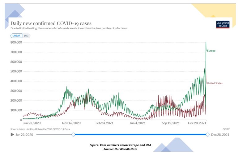 మునుపటి గరిష్ట స్థాయిలో, యూరప్లో రోజువారీ కొత్త కేసులుగా రోజుకు 280k కేసులు మాత్రమే నమోదయ్యాయి; కానీ ఇప్పుడు, యూరప్లో రోజుకు 800k కంటే ఎక్కువ కేసులు రోజువారీ కొత్త కేసులుగా చూస్తున్నారు. USAలో చాలా వరకు ఇదే కేసు. జనవరి 2021లో USAలో రోజుకు గరిష్టంగా 303k కేసులు నమోదయ్యాయి, కానీ ఇప్పుడు రోజుకు దాదాపు 380k కేసులు నమోదవుతున్నాయి. ఐరోపాలో మరణాల సంఖ్య మునుపటి వేవ్లో ఉన్నంత చెడ్డది కానప్పటికీ, యుఎస్ ప్రమాదకరమైన పరిస్థితిని చూస్తోంది, ఇది త్వరలో దాని మునుపటి గరిష్టాలను అధిగమించవచ్చు. మొత్తం సంఖ్యలలో ఓమిక్రాన్ కేసుల వాటా స్థిరమైన పెరుగుదలను చూస్తోంది.